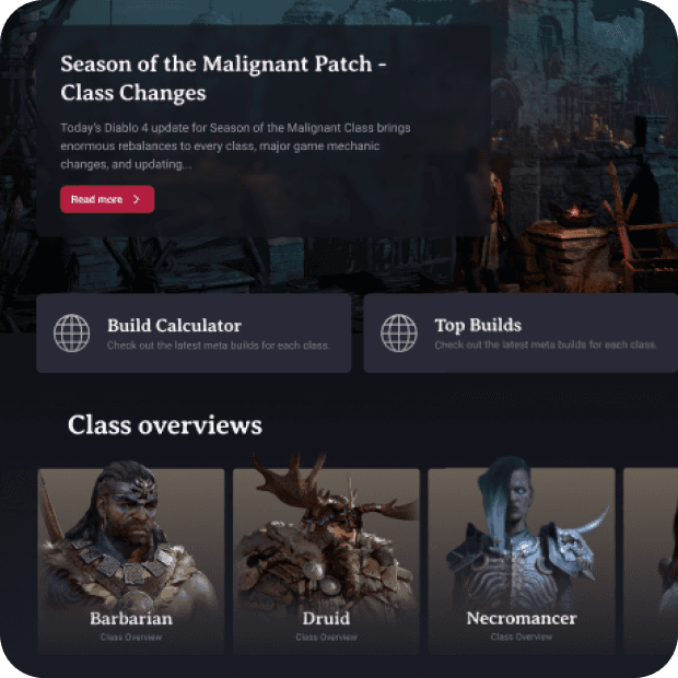 Web and mobile application for the game Diablo IV where you can read guides, create builds and make optimizations for your character utilizing custom calculator and simulation data.