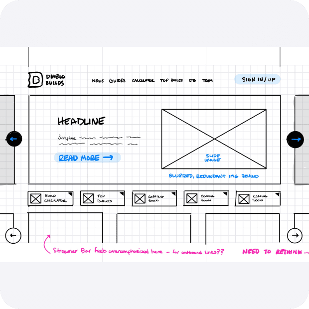 The design process for Diablo Builds started with research to understand user needs and the Diablo community. This informed initial concept development, where ideas were brainstormed and sketched.