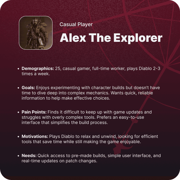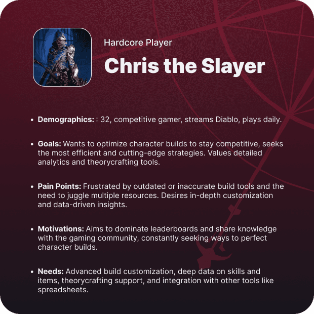 User interviews were conducted to gather insights directly from players and understand their needs and pain points. We spoke with a diverse group of Diablo fans, from casual to hardcore players, to capture a broad perspective. The interviews focused on how they currently build characters, what tools they use, and what challenges they face. Key insights included the need for a more intuitive, streamlined interface for creating and sharing builds. Players emphasized the importance of quick access to updated game data. The interviews took at most 30 minutes, here are some of the questions we asked: